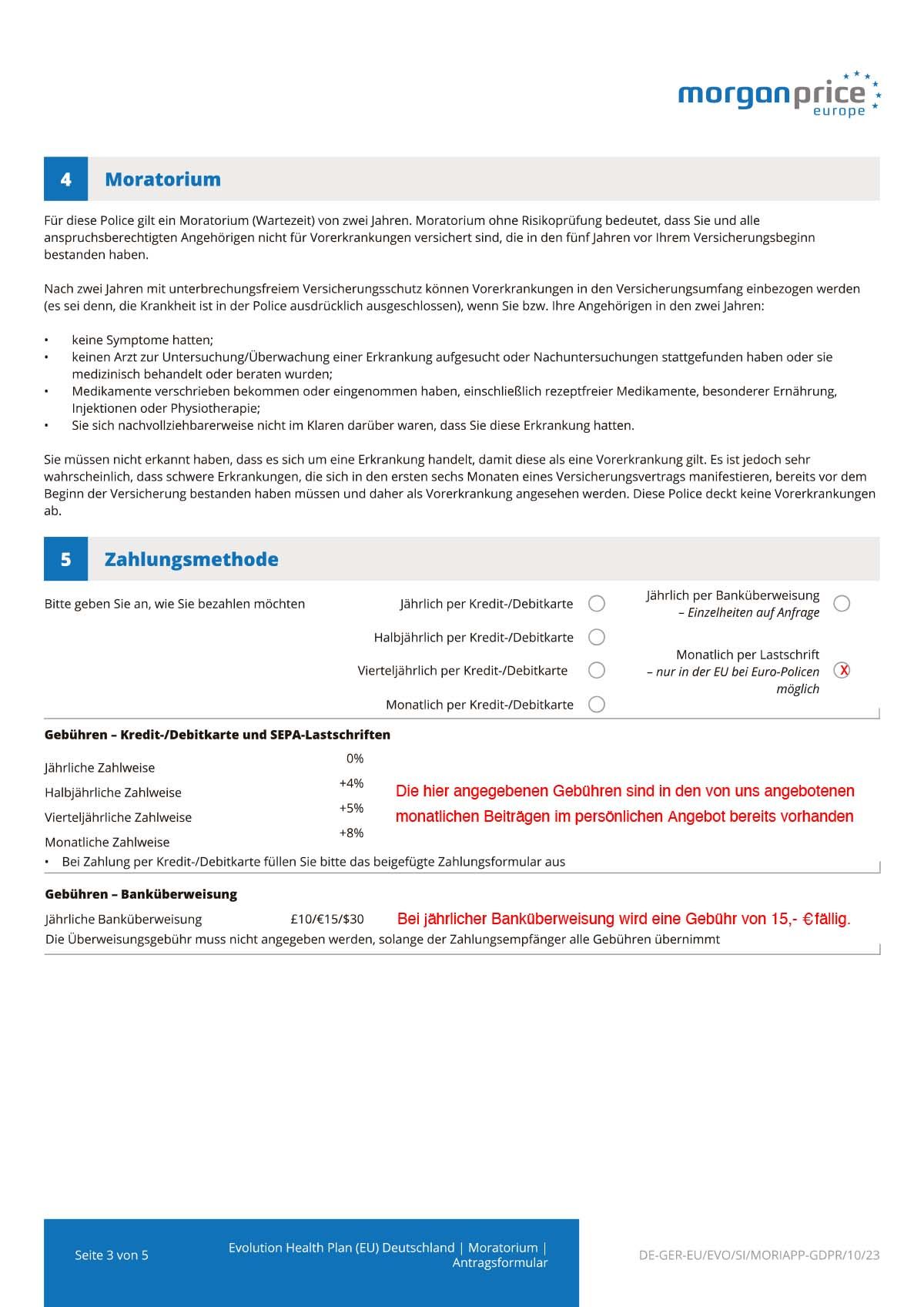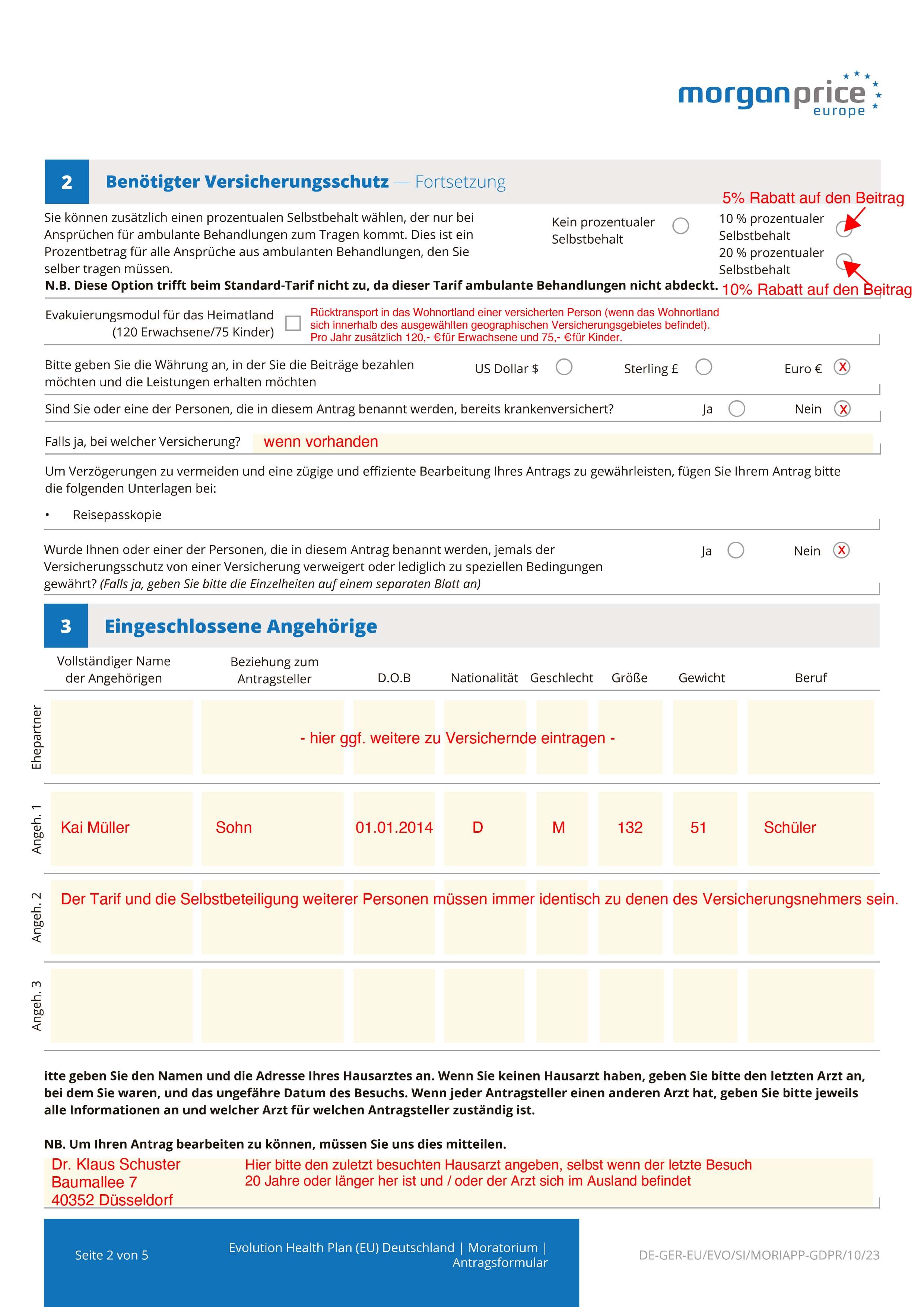 Dies ist ein vorläufiger Antrag, den Sie uns bitte zusenden. Ein Mitarbeiter wird Sie telefonisch kontaktieren und mit Ihnen den vollen Antrag ausfüllen. Alle Antragsformulare werden vor der Annahme geprüft. Daher wird kein Versicherungsschutz gewährt, bevor eine Bestätigung vorliegt. Die Beiträge für eine Pflegeversicherung sind nicht enthalten.